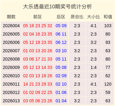 大乐透2026013期开奖,本期奖号:前区03、05、06、23、26,后区01、04。其中前区奖号质合比为3:2,大小比为2:3,和值为63。