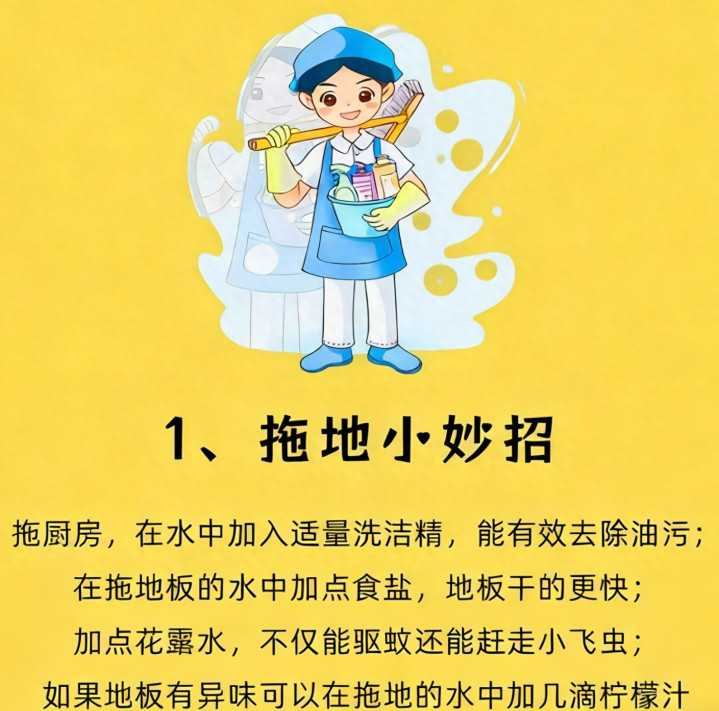 以前我拖地总用清水,结果拖完地还是灰蒙蒙的,踩上去还留脚印,半天都干不了。后来我妈教我加了几样东西,效果直接翻了倍: