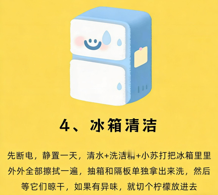 懒人技巧:融化的冰水可以用盆接着,用来冲厕所,不浪费;清洁时,用旧牙刷刷冰箱的缝隙,能把藏在里面的污渍刷干净;柠檬可以换成橘子皮、柚子皮,效果一样。