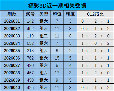 开奖回顾:福彩3D上期奖号为425,和值是11,跨度是3,其中奖号012路比为0:1:2。