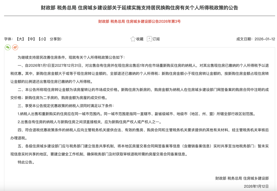 1月14日,财政部、国家税务总局、住房城乡建设部对外发布公告称,自2026年1月1日至2027年12月31日,对出售自有住房并在现住房出售后1年内在市场重新购买住房的纳税人,对其出售现住房已缴纳的个人所得税予以退税优惠。