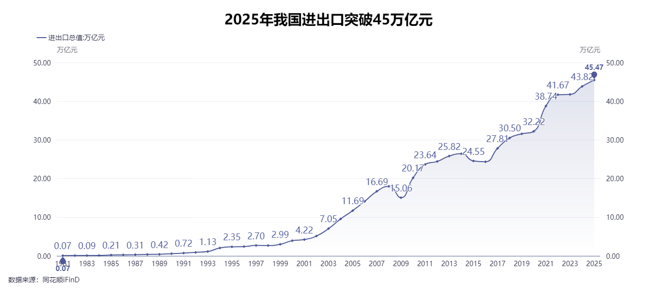 这意味着,我国进出口规模在2024年43万亿元规模的基础上,连续迈上两个万亿级台阶,进出口总额首次超过45万亿人民币。