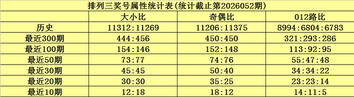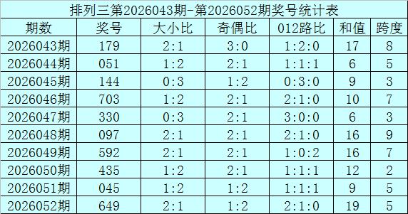 上期归来:陈设三第2026052期奖号为649,奖号012路比为2:1:0,奇偶比为1:2,大小比为2:1,和值为19,跨度为5。