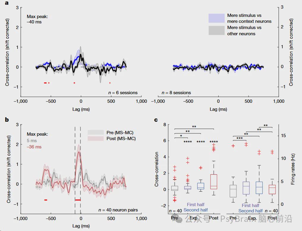 Figure 4提供了机制级线索:在同侧EC与海马之间,EC的纯内容神经元(mere stimulus, MS)放电可在约40 ms后预测海马纯情境神经元(mere context, MC)放电;这种不对称互相关在实验前不存在、在任务配对过程中出现并在实验后仍可检测到,符合刺激–情境联结通过时序依赖可塑性(spike-timing-dependent plasticity, STDP)被“写入”的图景。