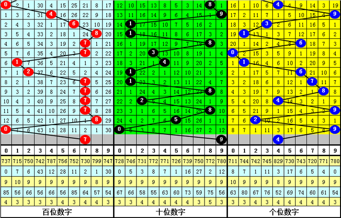 目前百位最冷号码为3,当前遗漏43期,该号码历史最大遗漏为56期,本期百位防号码3解冻。