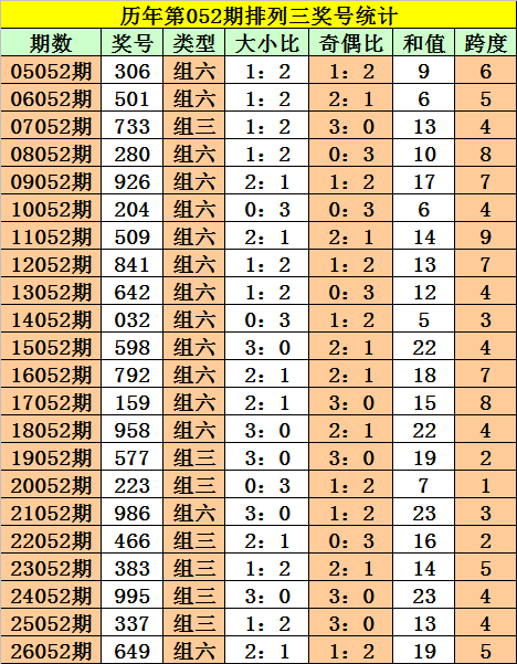 枚举三第2026052期奖号:649,和值19,跨度5,大小比2:1,奇偶比1:2。