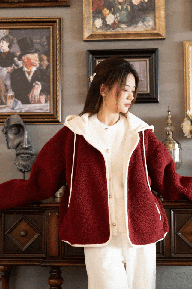 奶白色与车厘子红形成经典撞色,领口露出的奶白绒毛像落了层细雪,瞬间拉满冬日氛围感。