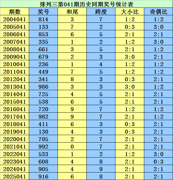 从2004年至今排列三已开出7515期奖号了,本期为排列三2026年第041期开奖,历史同期已出现22次奖号: