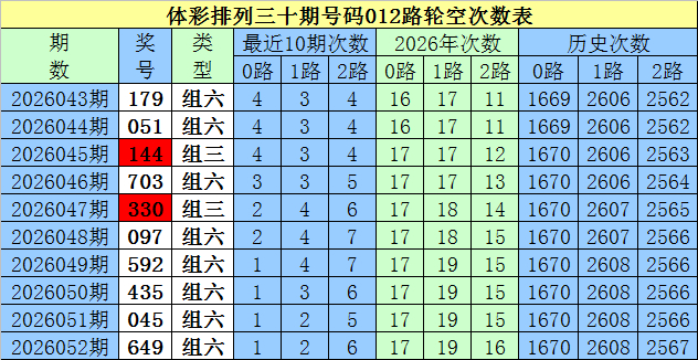 断档分析:上期奖号2路号码断档,0路号码阐扬较热。最近10期012路断头绪数划分为1次、2次、6次,其中2断头绪数较多,0路断头绪数较少,本期瞩目1路号码断档,防2路号码转热。
