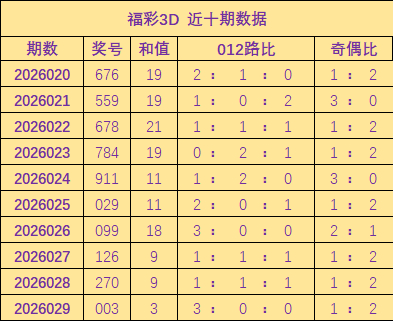 开奖回顾:福彩3D上期奖号为003,其中奖号012路比为3:0:0,和值为3,奇偶比1:2。